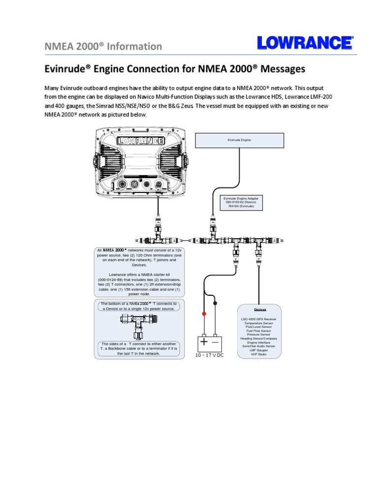 Lowrance evinrude engine interface cable allows connection between an evinrude engine and nmea200 network to display engine data.
